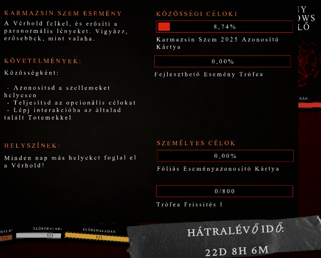 Van 2 közösségi, és 2 személyes célunk, amit a halloweeni esemény végéig teljesíthetünk. Amint az első cél eléri a 100%-ot, elkezdhetjük a következőt.