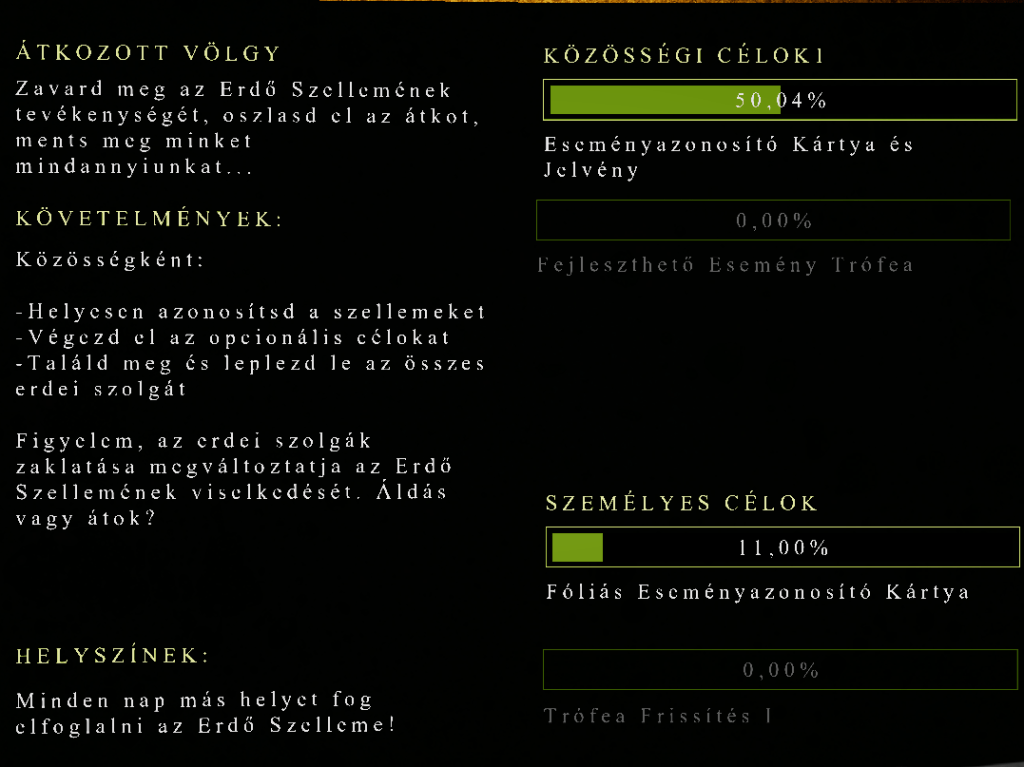 Van 2 közösségi és 2 személyes célunk, amit az esemény végéig teljesítenünk kell. Amint az első cél eléri a 100%-ot, elkezdhetjük a következőt. A húsvéti esemény csapatpontok, amiket az esemény során szerzünk, automatikusan hozzáadódnak a közösségi és a személyes célokhoz.