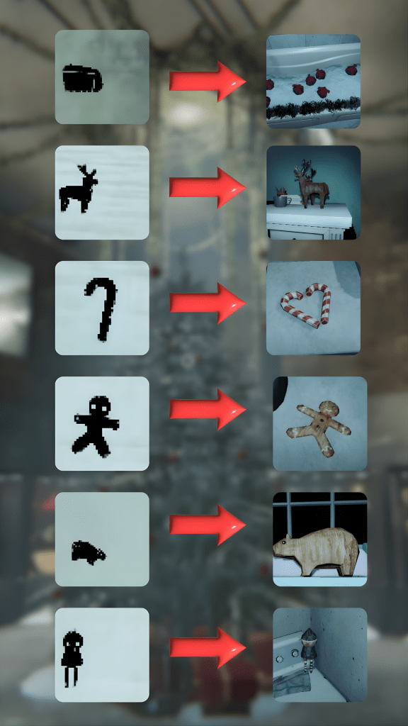 Meg kell keresnünk a pályán ezeket az ajándékokat, és be kell tegyük a zsákba. Ha nem a listán szereplő tárgy kerül a zsákba, a Krampus megharagszik ránk, és kapunk tőle egy szenet. Ha jól teljesítjük a feladatot, akkor viszont jutalmat kaphatunk, ami lehet egy véletlenszerű tárgy (feszület, só, stb), egy hógolyókilövő pisztoly, megehető süti, stb. Minden pályán máshol találjuk ezeket az ajándékokat, nézzük hogyan is néznek ki: