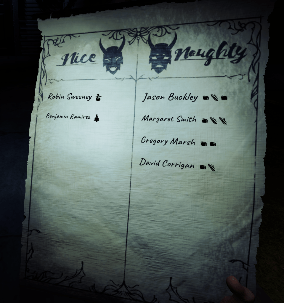 Minden éppen aktív pályán találunk egy zsákot és egy listát, amin a jó és rossz gyerekek neve és ajándéka van rajta.